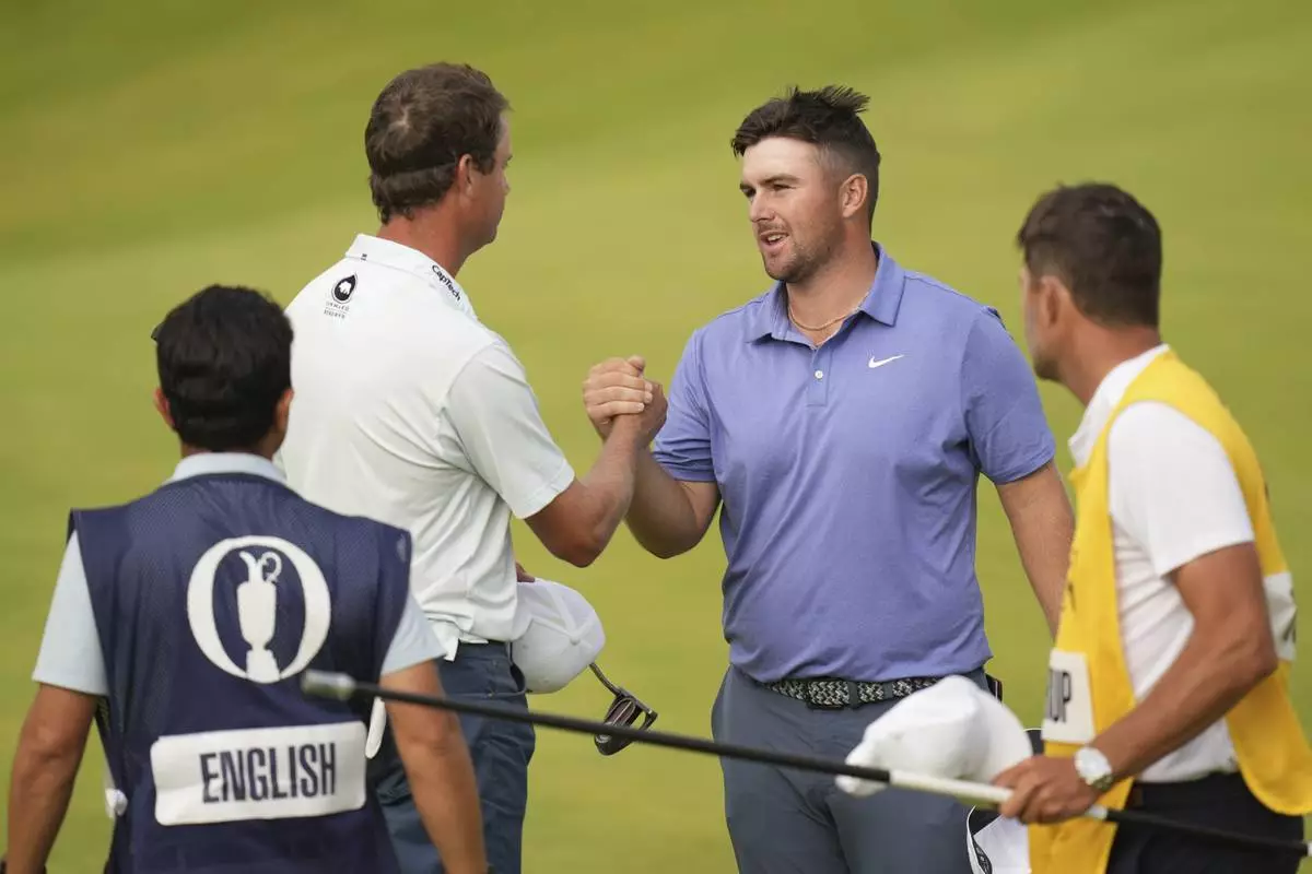 Chris Gotterup of the United States, right and Harris English of the United States shake hands on the 18th green after completing their final round of the British Open golf championship at the Royal Portrush Golf Club, Northern Ireland, Sunday, July 20, 2025. (AP Photo/Francisco Seco)