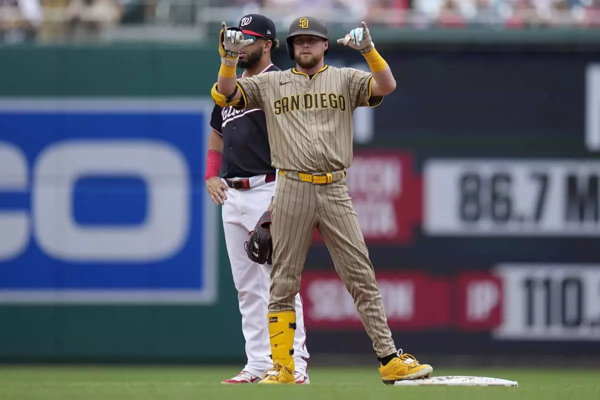 San Diego Padres' Jake Cronenworth celebrates after hitting an RBI-double against the Washington Nationals during the first inning of a baseball game at Nationals Park, Sunday, July 20, 2025, in Washington. (AP Photo/Jess Rapfogel)