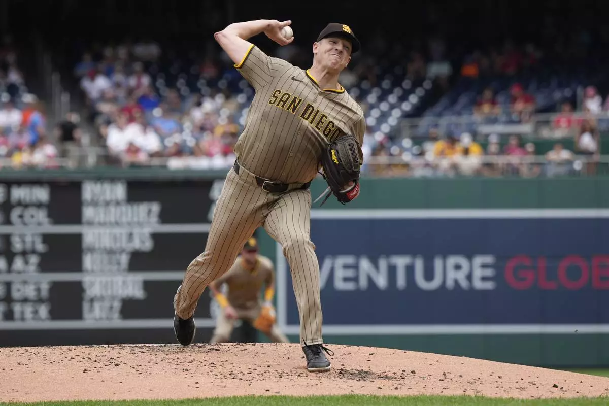 San Diego Padres starting pitcher Nick Pivetta throws to the Washington Nationals during the first inning of a baseball game at Nationals Park, Sunday, July 20, 2025, in Washington. (AP Photo/Jess Rapfogel)