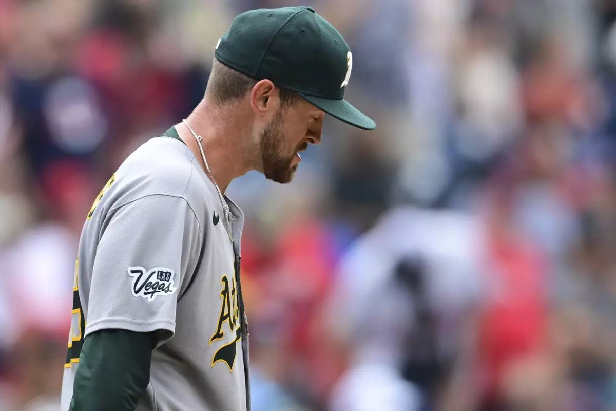 Athletics starting pitcher Jeffrey Springs reacts after a three RBI double by Cleveland Guardians' David Fry during the fourth inning of a baseball game, Sunday, July 20, 2025, in Cleveland. (AP Photo/David Dermer)