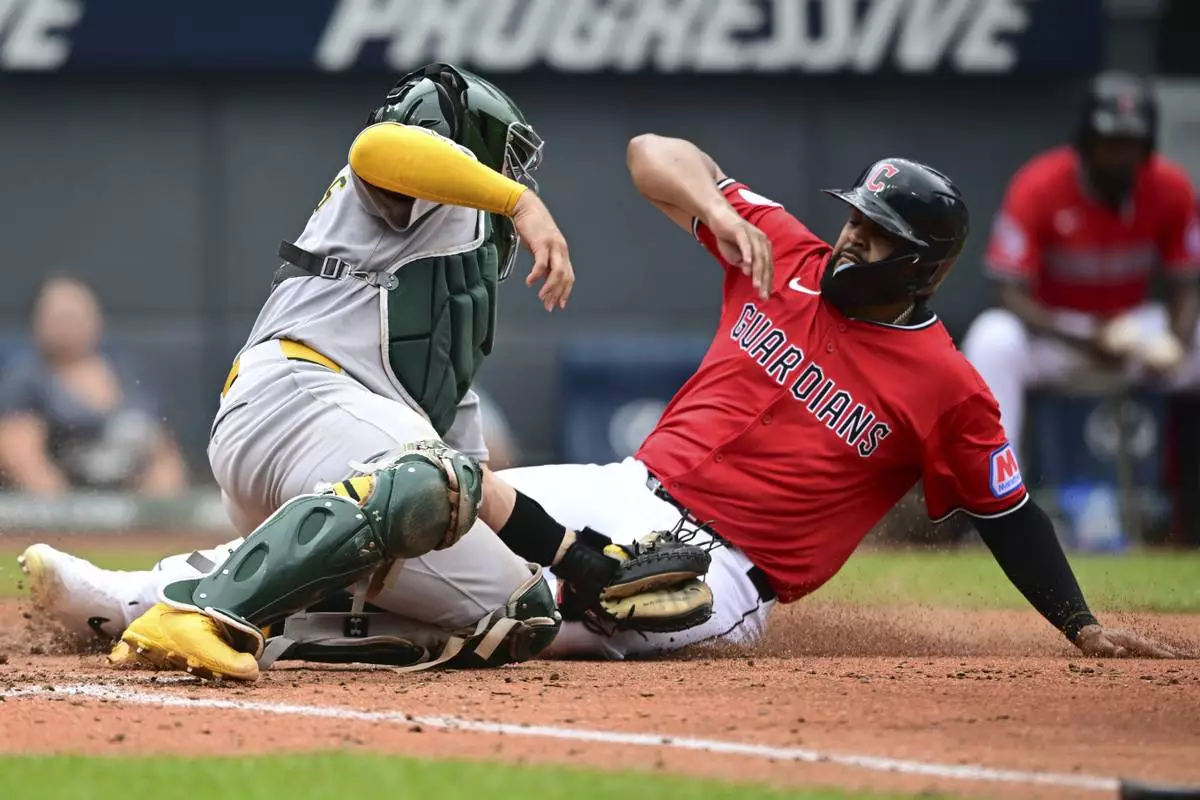 Athletics catcher Shea Langeliers tags out Cleveland Guardians outfielder Johnathan Rodríguez at home plate during the fourth inning of a baseball game, Sunday, July 20, 2025, in Cleveland. (AP Photo/David Dermer)