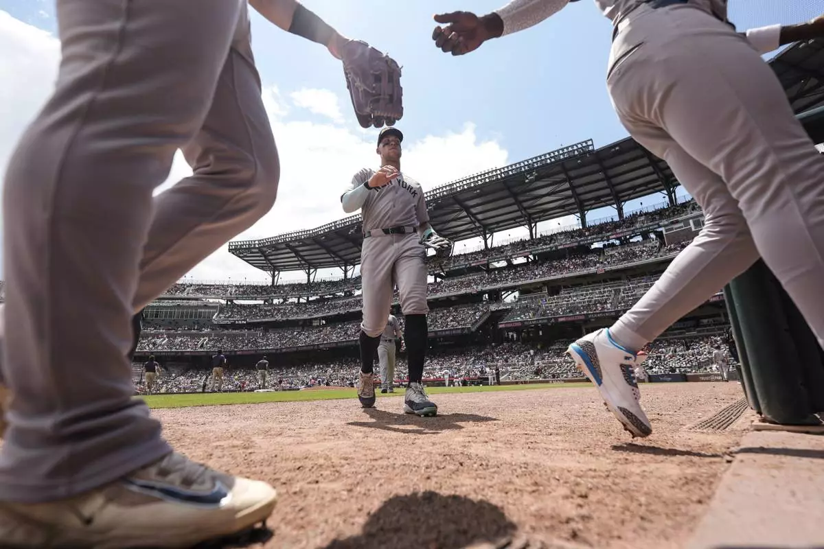 New York Yankees outfielder Aaron Judge, center, walks with his team back to the dugout in the sixth inning of a baseball game against the Atlanta Braves, Sunday, July 20, 2025, in Atlanta. (AP Photo/Mike Stewart)