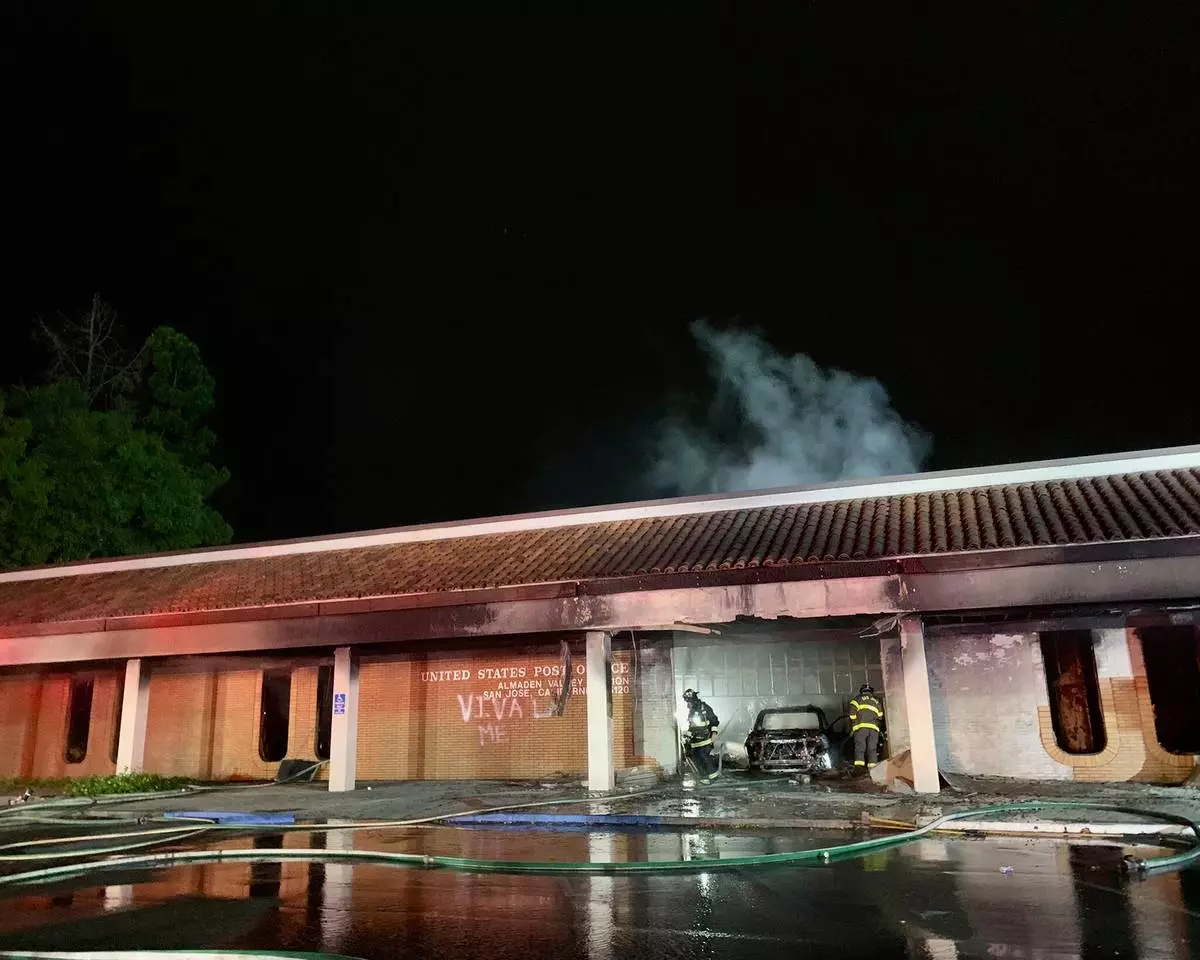 SAN JOSE, Calif. (AP) — A suspect was arrested after a car crashed into a post office in San Jose, California, early Sunday, causing the building to go up in flames, authorities said. No injuries were reported.