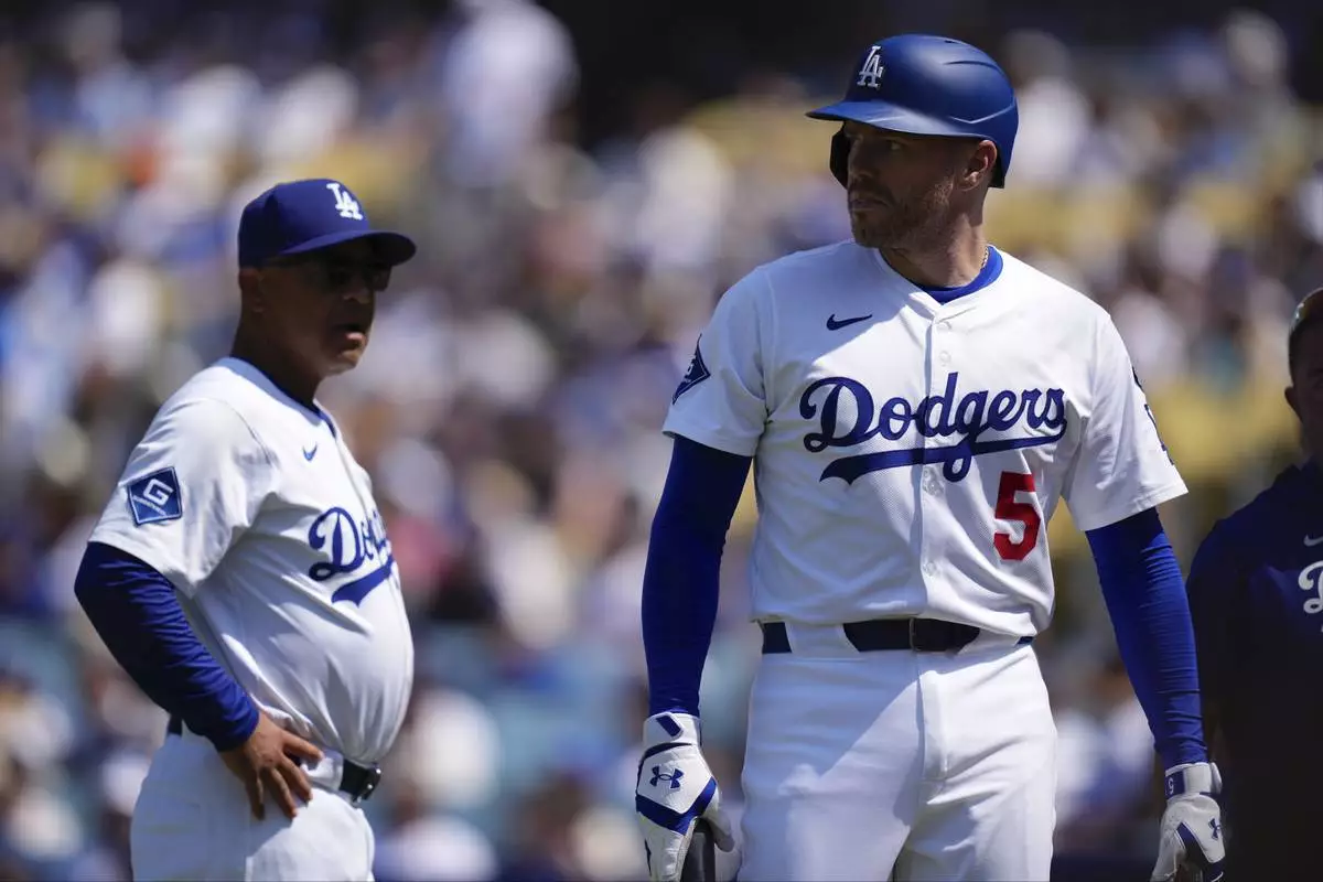 Los Angeles Dodgers' Freddie Freeman, left, walks off the field as manager Dave Roberts stands by after being hit by a pitch during the sixth inning of a baseball game against the Milwaukee Brewers, Sunday, July 20, 2025, in Los Angeles. (AP Photo/Mark J. Terrill)