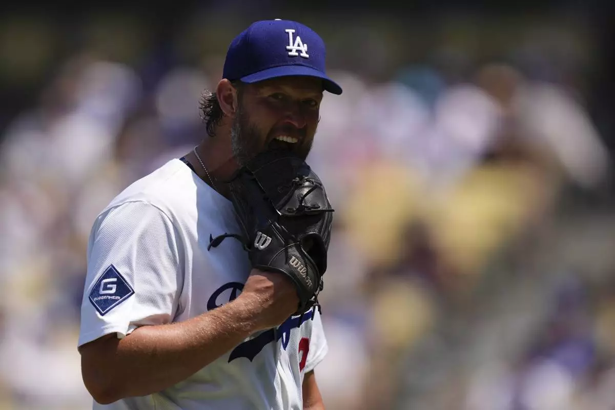 Los Angeles Dodgers starting pitcher Clayton Kershaw bites his glove after being taken out of the game I'm the fifth during inning of a baseball game against the Milwaukee Brewers, Sunday, July 20, 2025, in Los Angeles. (AP Photo/Mark J. Terrill)