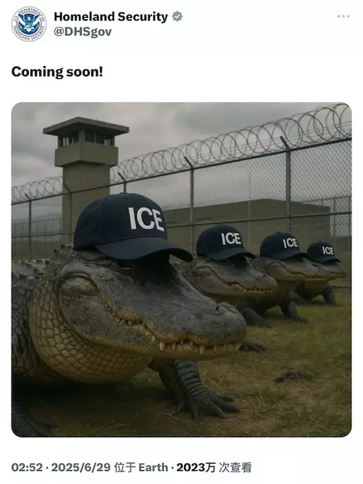 Screenshot of Homeland Security's social media post featuring alligators in ICE (Immigration and Customs Enforcement) caps – because apparently joking about human suffering is now official policy.