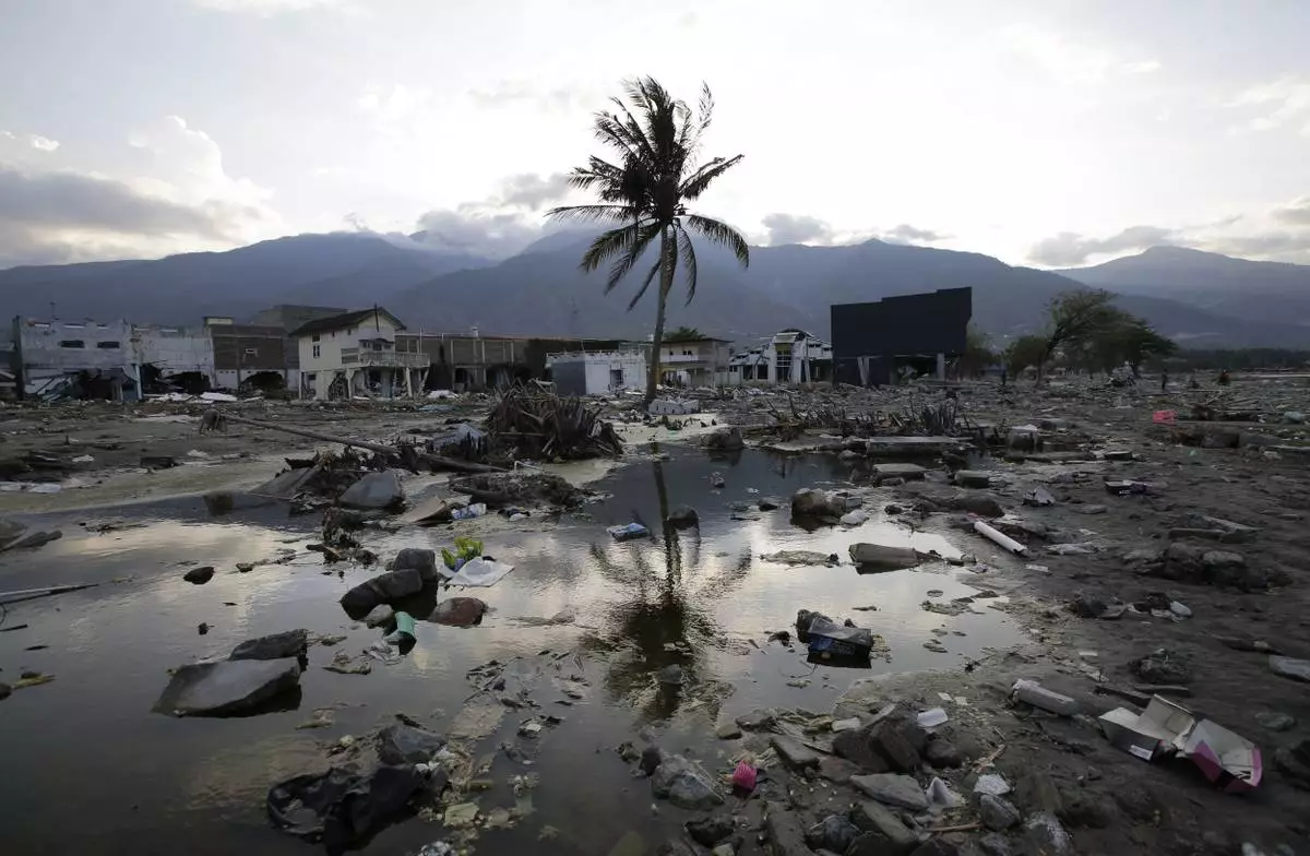 FILE - A lone tree stands in the debris from structures that were wiped out after a massive earthquake and tsunami hit Palu, Central Sulawesi, Indonesia, Thursday, Oct. 4, 2018. (AP Photo/Aaron Favila, File)