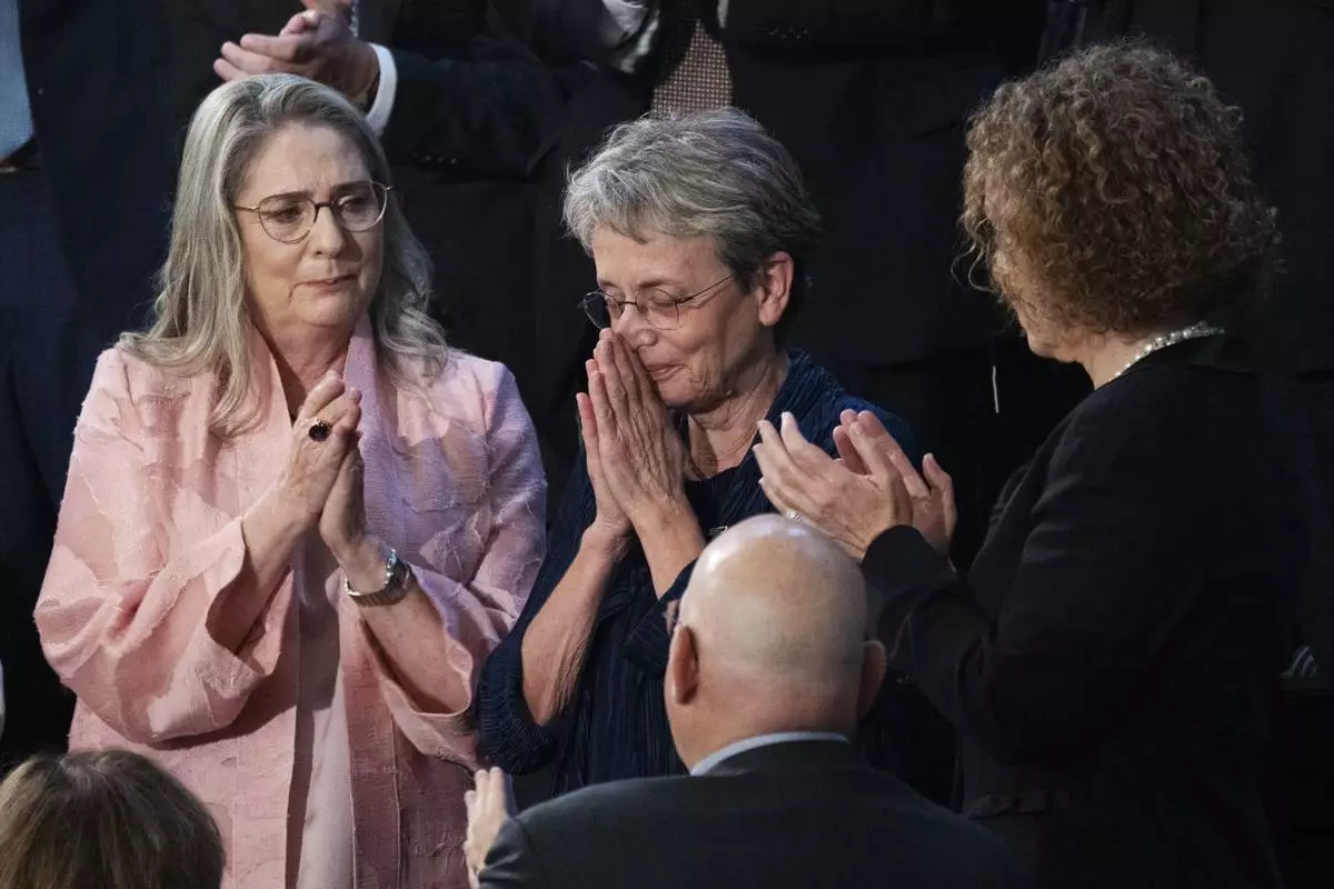 FILE - Leah Goldin, whose son Hadar was killed in the Gaza war in 2014, reacts as she is acknowledged by Israeli President Isaac Herzog during his speech to a joint session of Congress, Wednesday, July 19, 2023, at the Capitol in Washington, accompanied by Israeli first lady Michal Herzog, left. (AP Photo/Jacquelyn Martin, File)