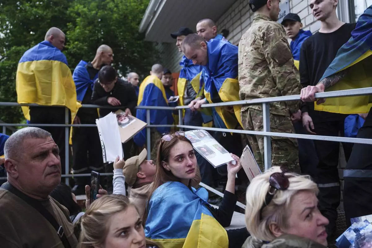FILE - Relatives of missing and imprisoned Ukrainian soldiers show photographs to servicemen returning from captivity in a POW exchange in Ukraine, Tuesday, May 6, 2025. (AP Photo/Evgeniy Maloletka, File)