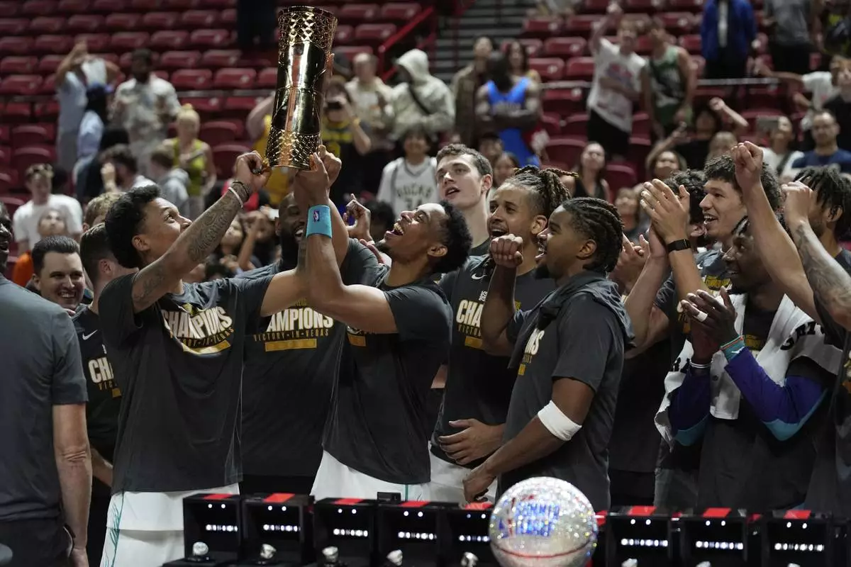 Charlotte Hornets players celebrate after defeating the Sacramento Kings in an NBA Summer League championship basketball game Sunday, July 20, 2025, in Las Vegas. (AP Photo/John Locher)