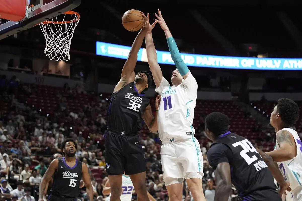 Sacramento Kings' Dylan Cardwell, left, and Charlotte Hornets' Ryan Kalkbrenner battle for a rebound during the first half of an NBA Summer League championship basketball game Sunday, July 20, 2025, in Las Vegas. (AP Photo/John Locher)