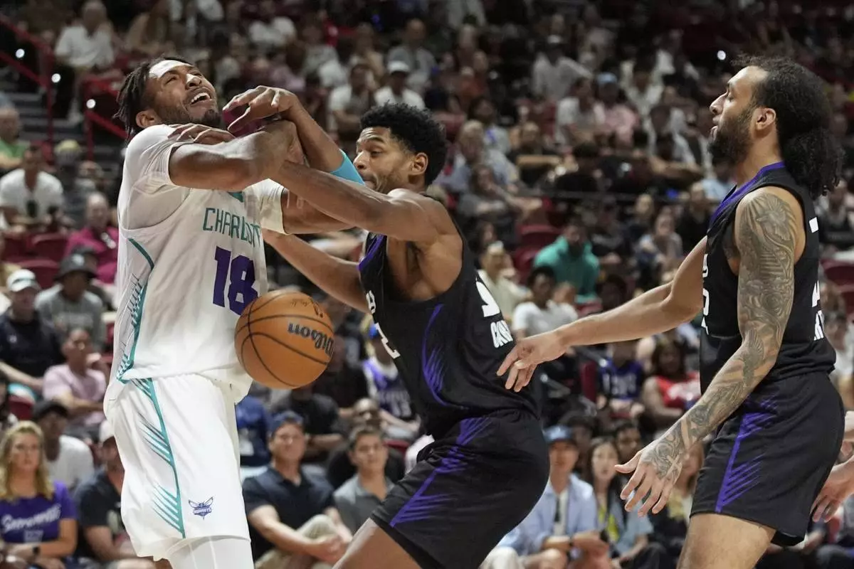 Sacramento Kings' Dylan Cardwell fouls Charlotte Hornets' James Banks III during the first half of an NBA Summer League championship basketball game Sunday, July 20, 2025, in Las Vegas. (AP Photo/John Locher)