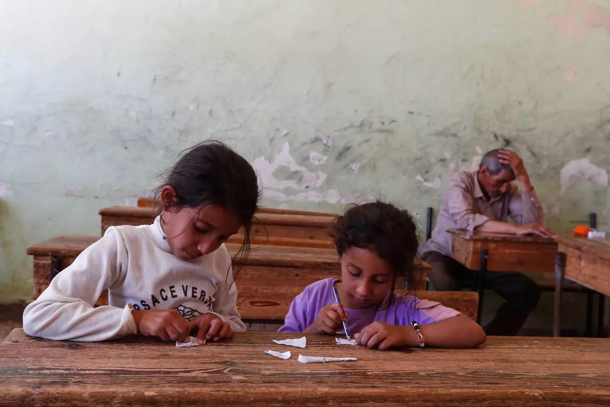 Displaced Bedouin girls who fled with their families from the town of Shahba in southern Sweida province due to clashes between Bedouin clans and Druze militias, draw on scraps of paper inside a classroom turned shelter in the town of Nahtah, in the eastern part of Daraa province, Syria, Monday, July 21, 2025. (AP Photo/Omar Sanadiki)