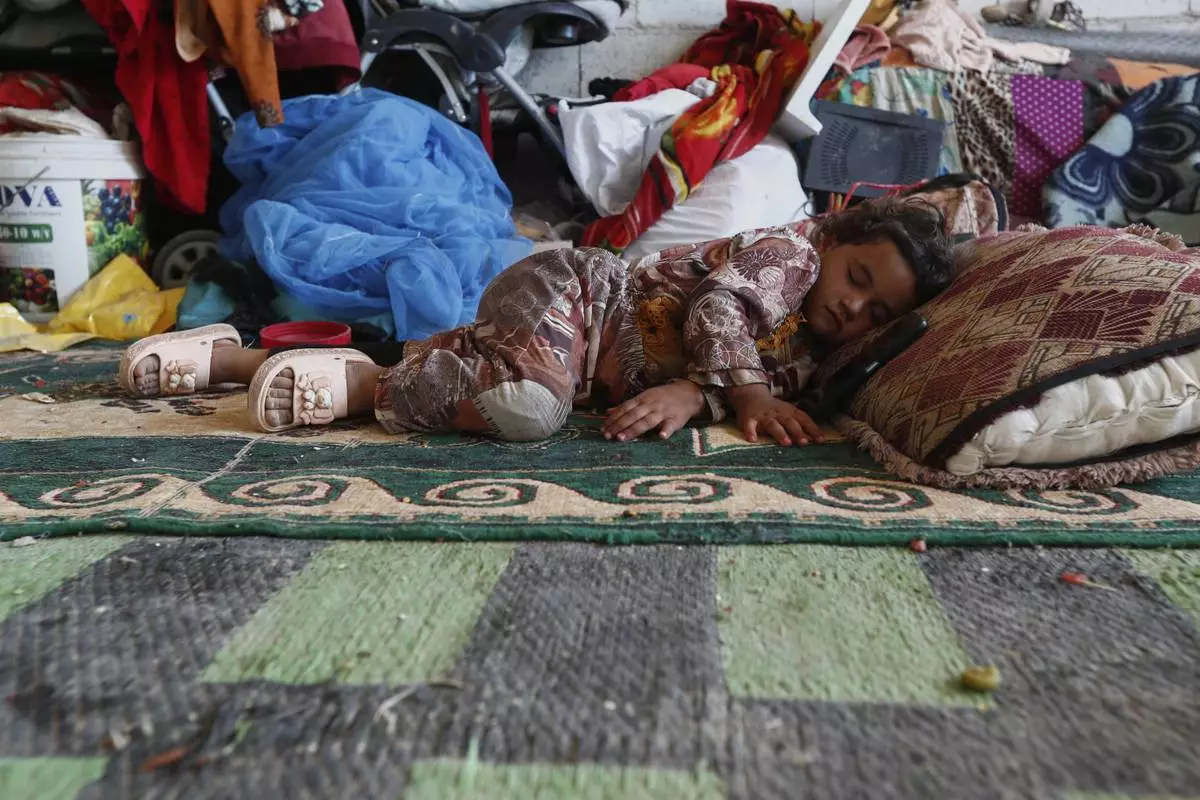 A displaced Bedouin girl sleeps inside a shelter after her family fled their home due to clashes between Bedouin clans and Druze militias, in Busra al-Harir village, southern Syria, Sunday, July 20, 2025. (AP Photo/Omar Sanadiki)