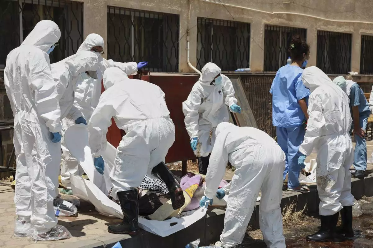 Morgue workers place the bodies of unidentified people killed during clashes between Bedouin clans and Druze militias, into plastic bags outside the National Hospital in Sweida, Syria, Monday, July 21, 2025. (AP Photo/Fahd Kiwan)