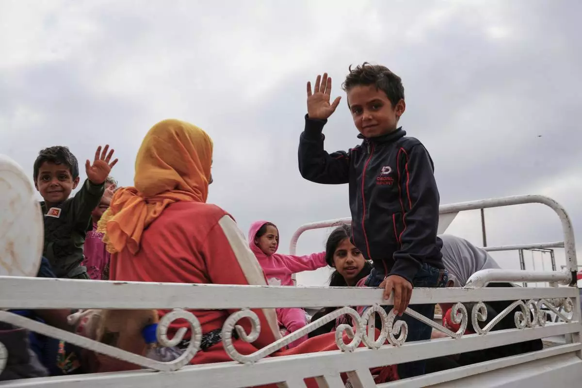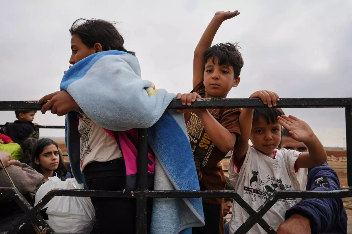 Syrian Bedouin families gesture as they ride in a convoy led by Red Crescent vehicles in Busra al-Harir, heading to Daraa after being evacuated from Sweida following more than a week of violent clashes, Monday, July 21, 2025. (AP Photo/Malek Khattab)