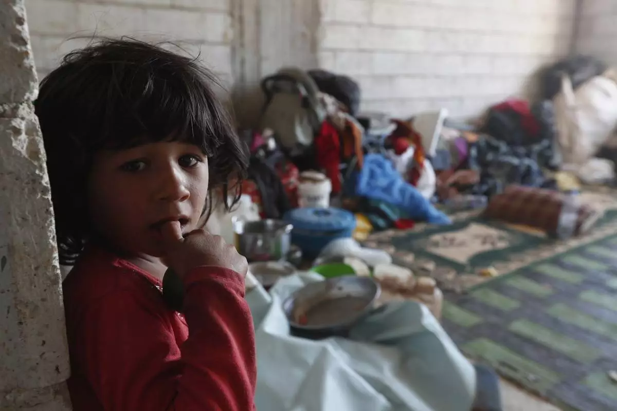 A displaced Bedouin girl stands inside a shelter after her family fled their home due to clashes between Bedouin clans and Druze militias, in Busra al-Harir village, southern Syria, Sunday, July 20, 2025. (AP Photo/Omar Sanadiki)