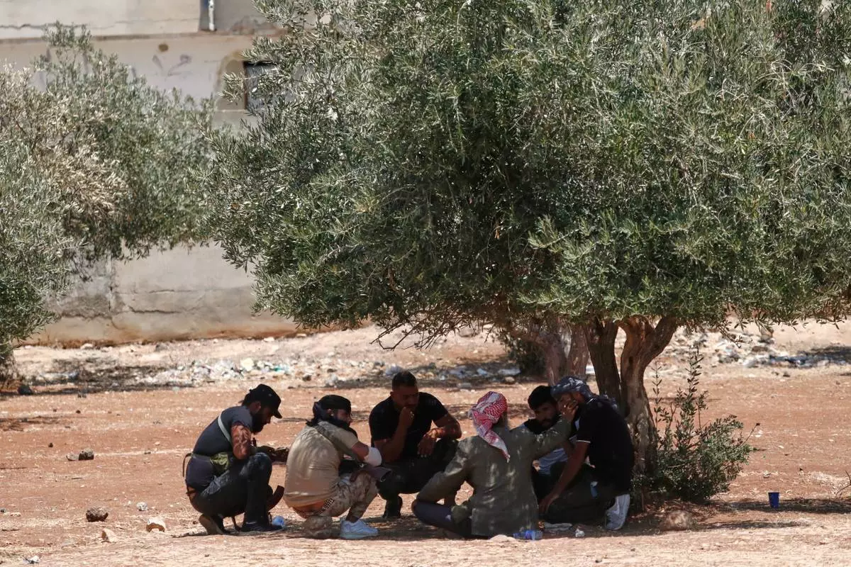 Bedouin fighters sit under the shade of an olive tree outside a temporary shelter housing Bedouin families who fled their homes in Shahba, a town in Syria's southern Sweida province, due to clashes between Bedouin clans and Druze militias, in the town of Nahtah, in the eastern part of Daraa province, Syria, Monday, July 21, 2025. (AP Photo/Omar Sanadiki)