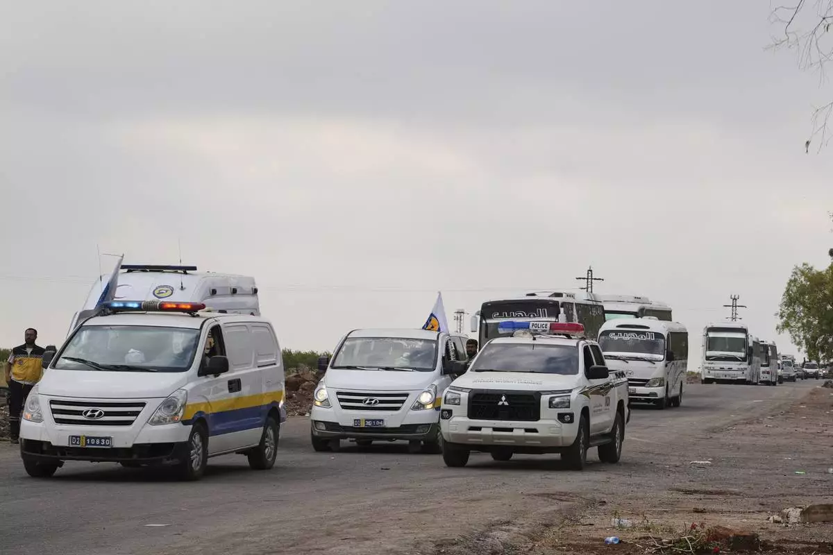Syrian Bedouin families ride in a convoy led by Red Crescent vehicles in Busra al-Harir, heading to Daraa after being evacuated from Sweida following more than a week of violent clashes, Monday, July 21, 2025. (AP Photo/Malek Khattab)