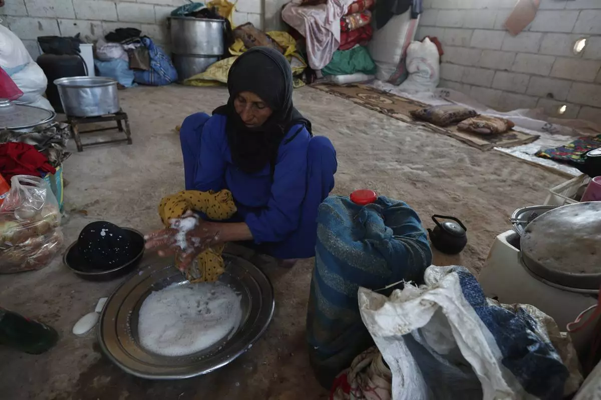 A displaced Bedouin woman washes clothes inside a shelter after fleeing her home due to clashes between Bedouin clans and Druze militias, in Busra al-Harir village, southern Syria, Sunday, July 20, 2025. (AP Photo/Omar Sanadiki)