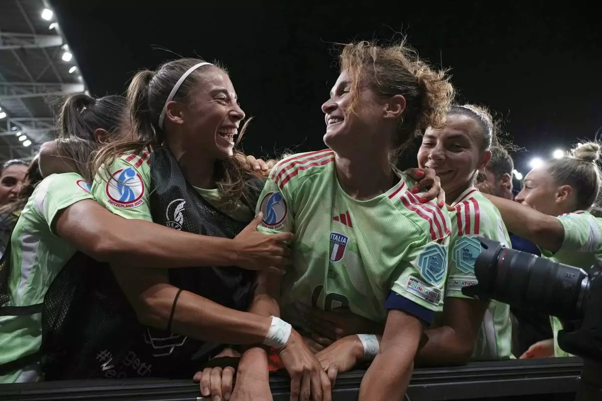 Soccer players and staff from Italy celebrate their victory after the Women's Euro 2025 quarterfinals soccer match between Norway and Italy at Stade de Geneve in Geneva, Switzerland, Wednesday, July 16, 2025. (Jean-Christophe Bott/Keystone via AP)