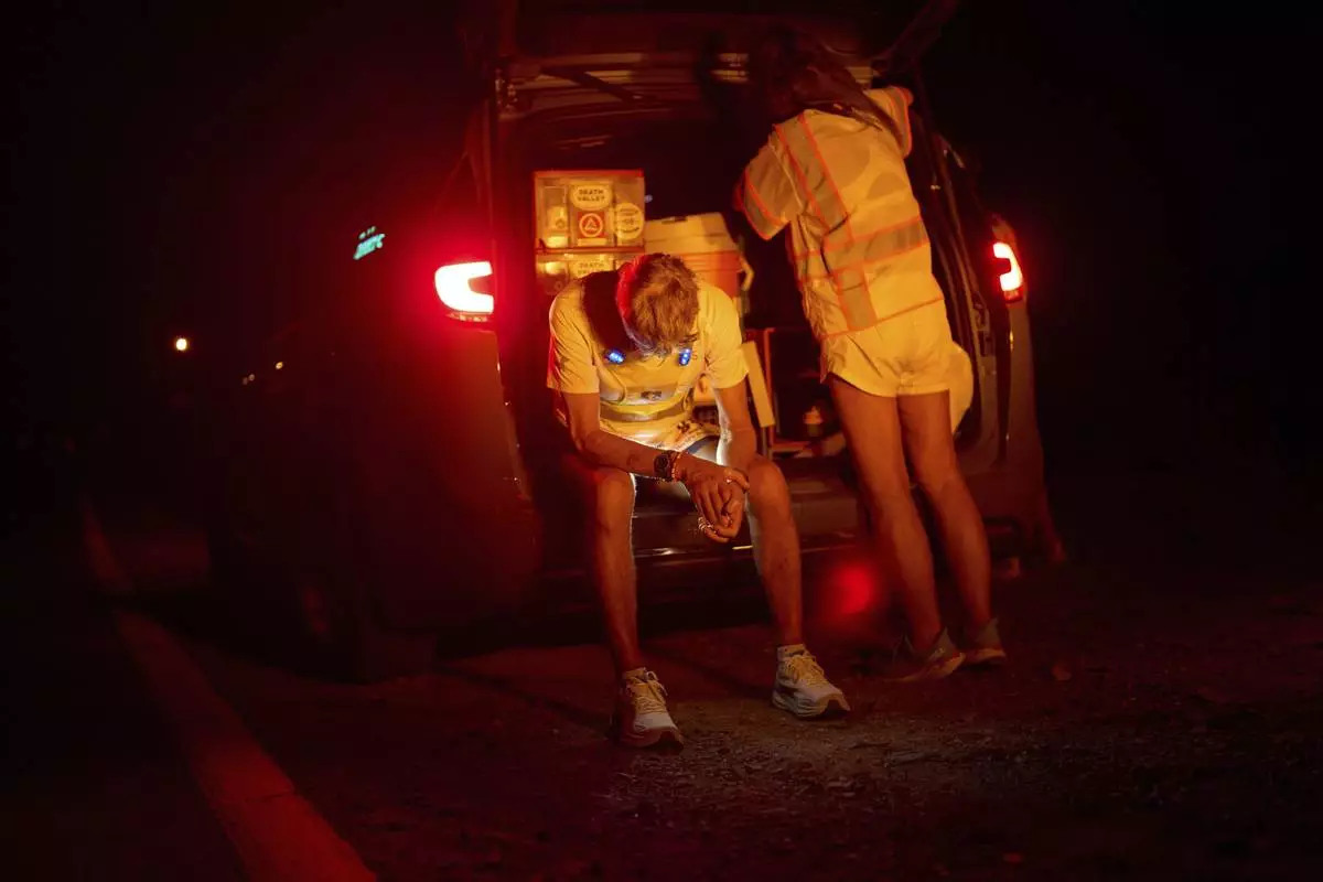 Danny Westergaard reacts while taking a break around the 24-hour mark during the Badwater 135 Ultramarathon, Tuesday, July 8, 2025, in Death Valley National Park, Calif. (AP Photo/John Locher)