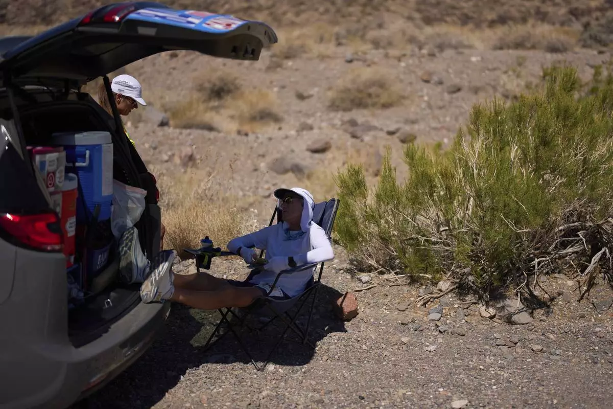 Danny Westergaard cools off in the shade while taking a short break during the Badwater 135 Ultramarathon, Tuesday, July 8, 2025, in Death Valley National Park, Calif. (AP Photo/John Locher)