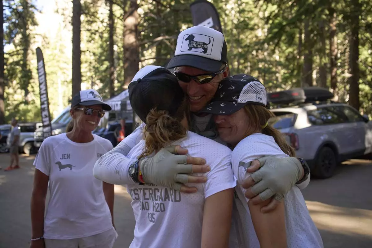 Danny Westergaard, second from right, embraces daughters Meagan Westergaard, right, and Madison Westergaard after finishing the Badwater 135 Ultramarathon, Wednesday, July 9, 2025, at Whitney Portal near Lone Pine, Calif. (AP Photo/John Locher)