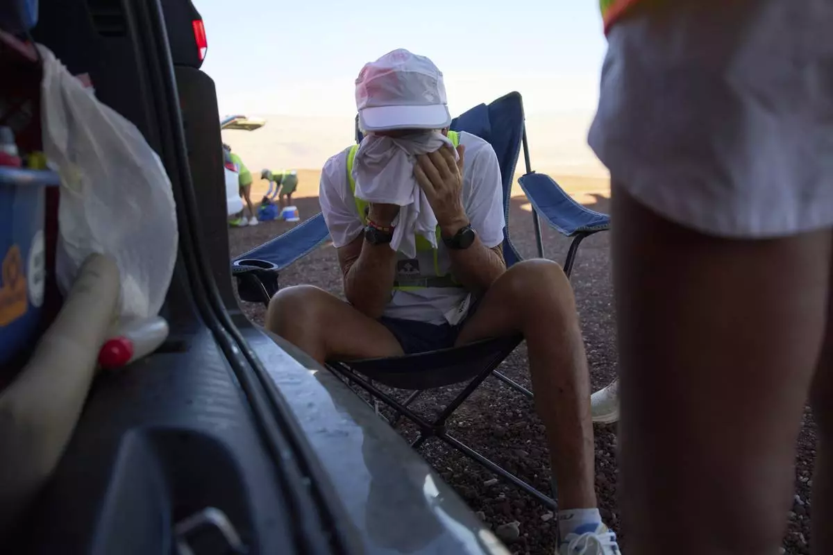 Danny Westergaard takes a break while competing in the Badwater 135 Ultramarathon, Tuesday, July 8, 2025, in Death Valley National Park, Calif. (AP Photo/John Locher)