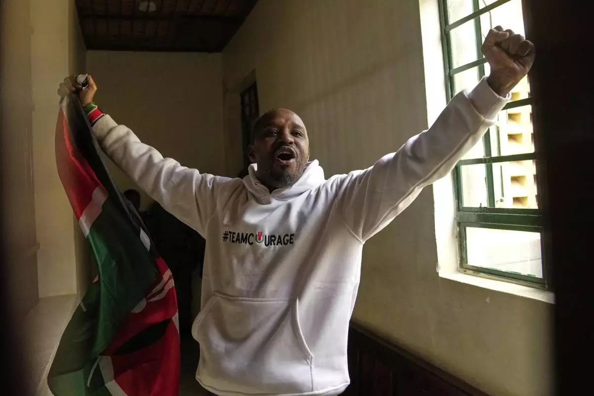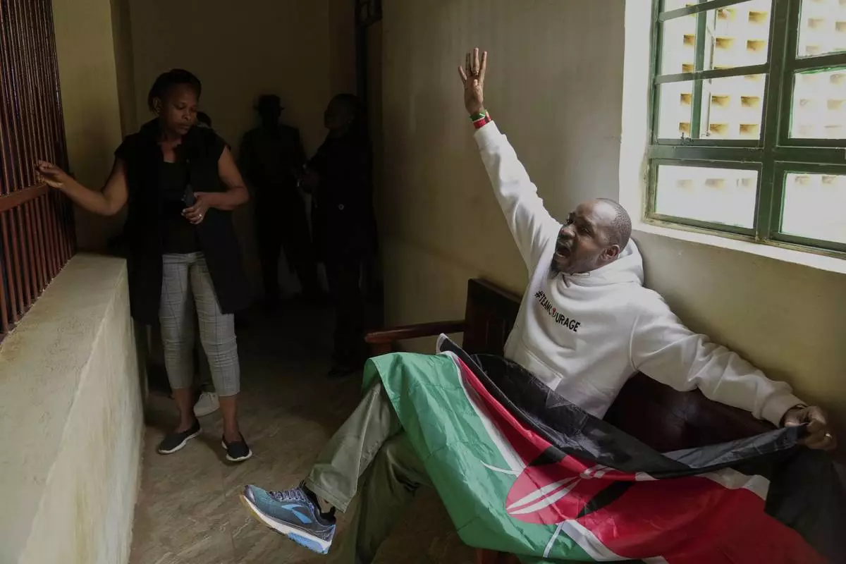 Prominent Kenyan activist Boniface Mwangi sings while holding a Kenyan flag in the dock at Kahawa Law Courts in Kiambu, Kenya, Monday, July 21, 2025. (AP Photo/Brian Inganga)