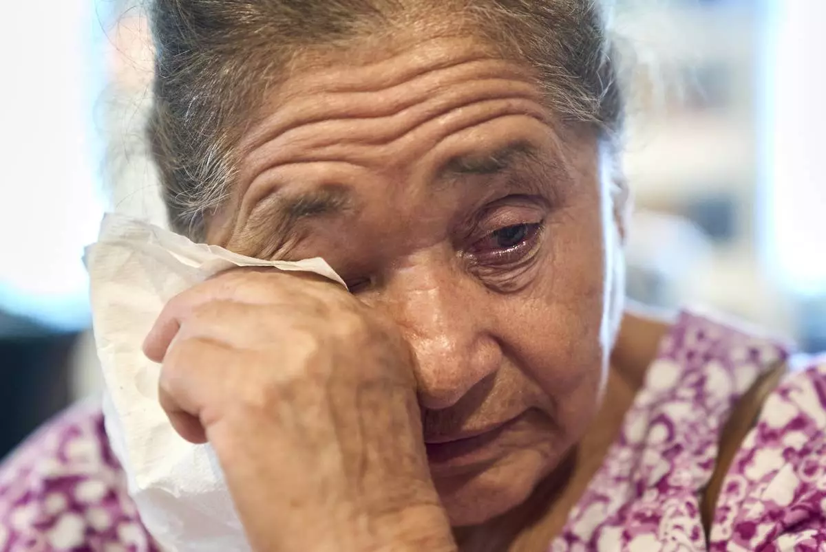 Maria Isabel de Perez, 82, of Welasco, Texas, cries as she recounts how her son was too scared to go to a hospital when he felt intense pain in his abdomen recently, leading to his near-death when his appendix burst, after she attended a diabetes clinic hosted by Holy Family Services, a birth center and women's clinic in the Rio Grande Valley, Wednesday, June 18, 2025, in Weslaco, Texas. (AP Photo/Jacquelyn Martin)