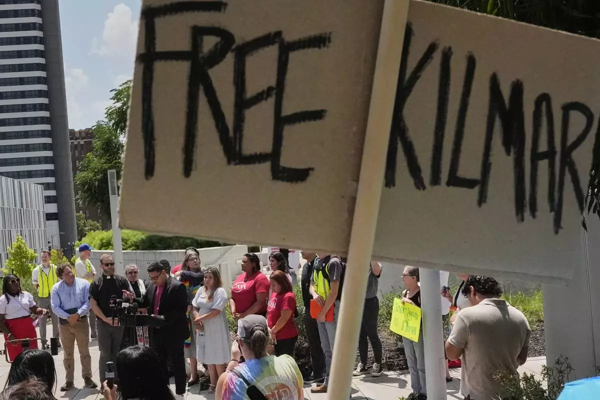 A rally sign is seen during a news conference outside the federal courthouse before a hearing for Kilmar Abrego Garcia, Wednesday, July 16, 2025, in Nashville, Tenn. (AP Photo/George Walker IV)