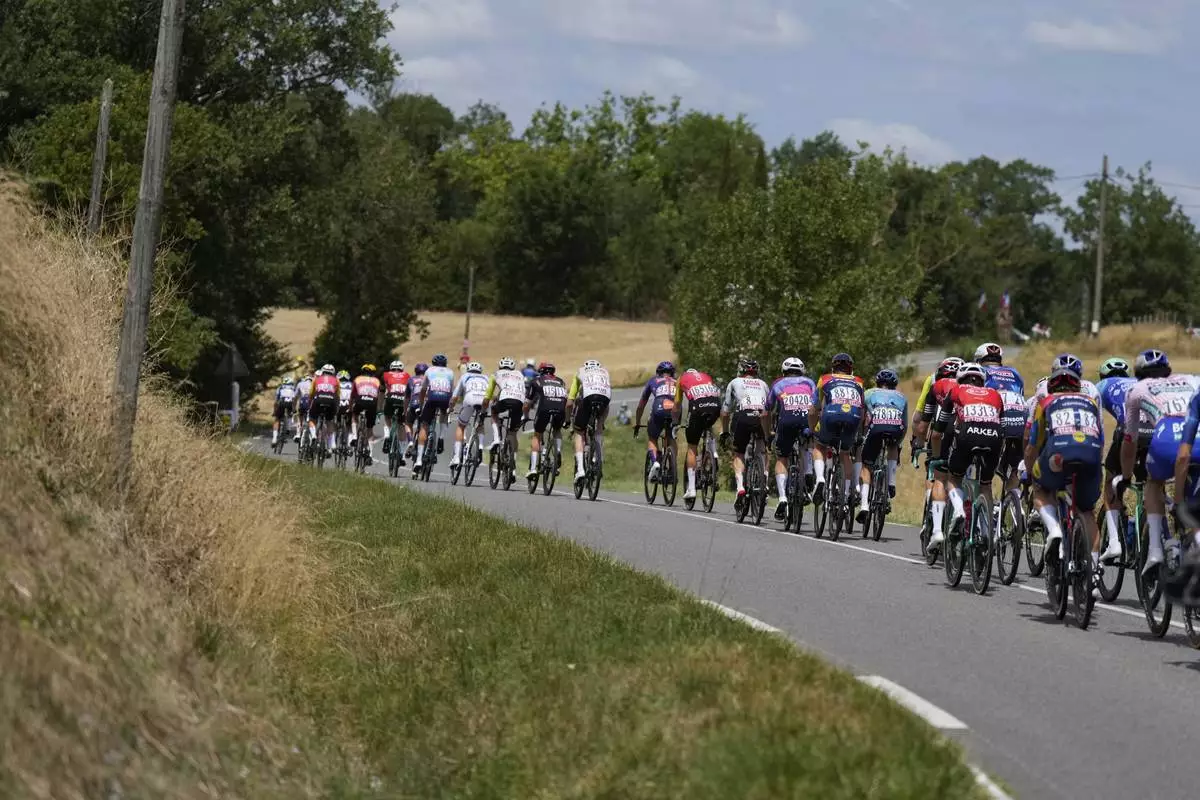The pack rides during the fifteenth stage of the Tour de France cycling race over 169.3 kilometers (105.2 miles) with start in Muret and finish in Carcassone, France, Sunday, July 20, 2025. (AP Photo/Mosa'ab Elshamy)