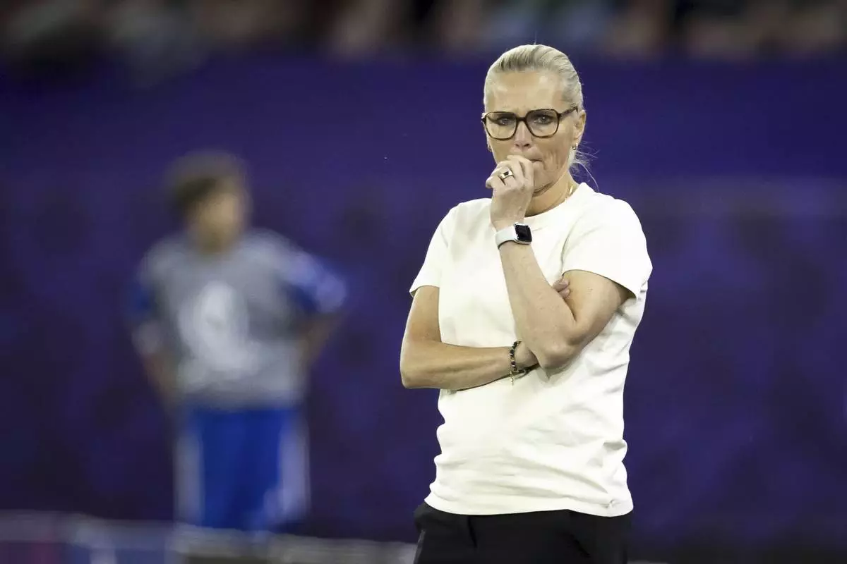 England's head coach Sarina Wiegman watches during the Women's Euro 2025 quarterfinals soccer match between Sweden and England at Stadion Letzigrund in Zurich, Switzerland, Thursday, July 17, 2025. (Michael Buholzer/Keystone via AP)
