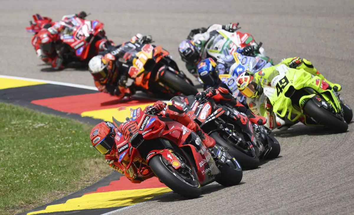 Marc Marquez from Spain from the Ducati Lenovo Team leads the field during the MotoGP race, German Grand Prix, at the Sachsenring circuit, in Hohenstein-Ernstthal, Germany, Sunday July 13, 2025. (Robert Michael/dpa via AP)