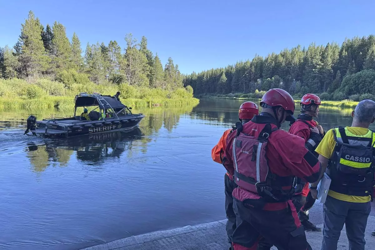 This photo provided by the Deschutes County Sheriff's Office shows search and rescue teams on the Deschutes River about 10 miles from Bend, Ore., after a fatal waterfall accident Saturday, July 19, 2025. (Deschutes County Sheriff's Office via AP)