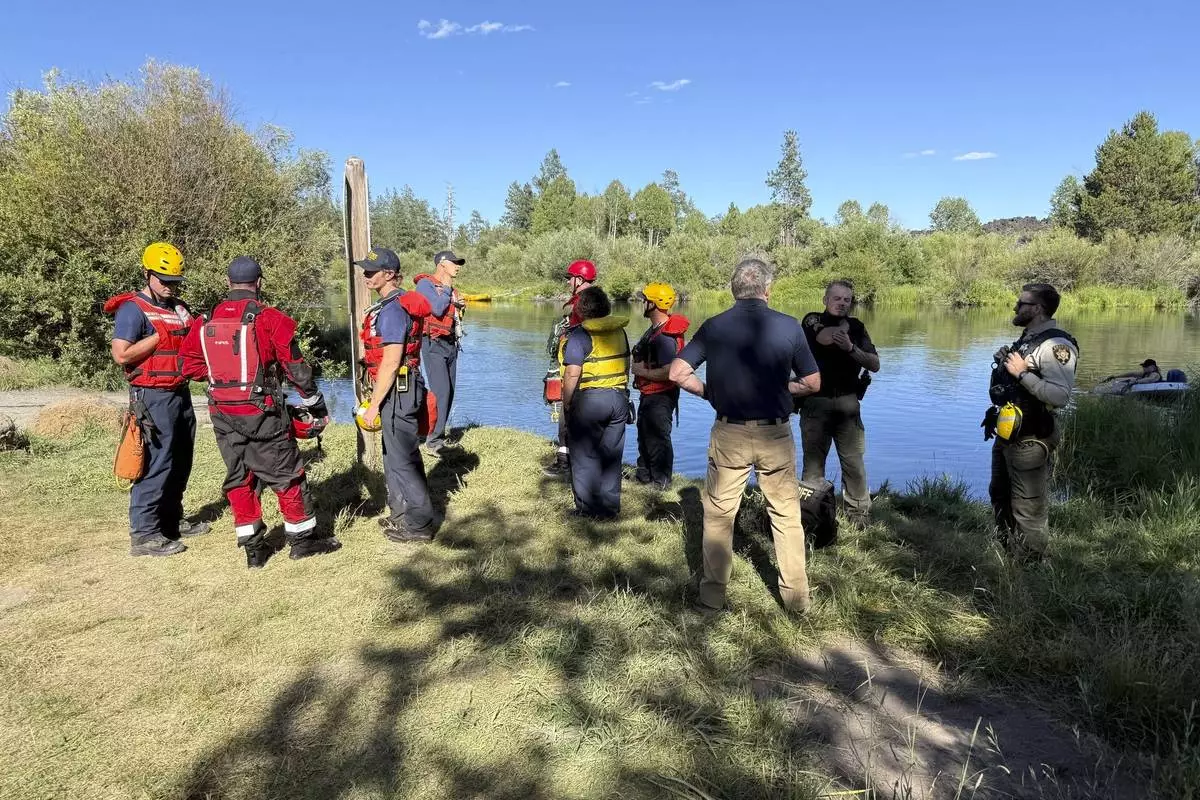 This photo provided by the Deschutes County Sheriff's Office shows search and rescue teams along the Deschutes River about 10 miles from Bend, Ore., after a fatal waterfall accident Saturday, July 19, 2025. (Deschutes County Sheriff's Office via AP)