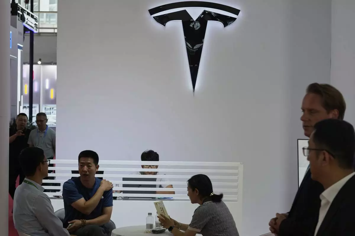 Visitors at the Tesla booth during the 3rd China International Supply Chain Expo at the China International Exhibition Center, in Beijing, China, Friday, July 18, 2025. (AP Photo/Mahesh Kumar A.)