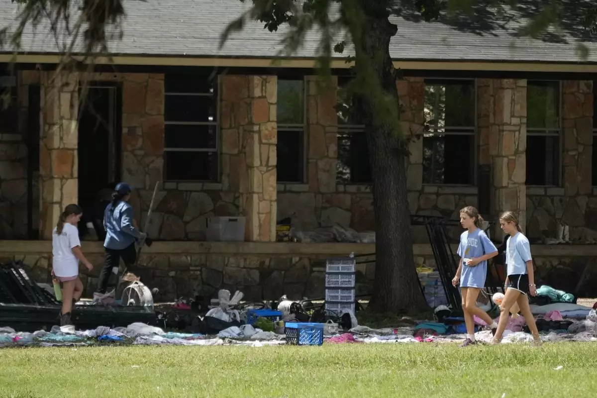 FILE - People sort through personal items at Camp Mystic in Hunt, Texas, on Wednesday, July 9, 2025. (AP Photo/Ashley Landis, File)