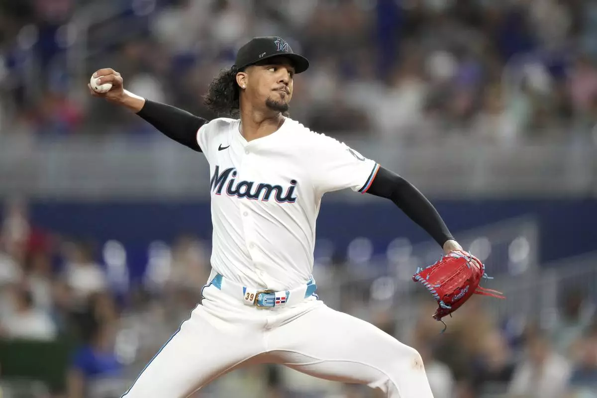 Miami Marlins starting pitcher Eury Perez pitches in the fourth inning of a baseball game against the San Diego Padres, Monday, July 21, 2025, in Miami. (AP Photo/Rebecca Blackwell)