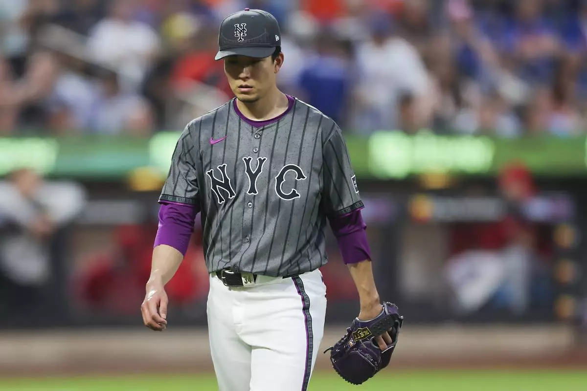 New York Mets pitcher Kodai Senga walks back to the dugout at the end of the third inning of a baseball game against the Los Angeles Angels, Monday, July 21, 2025, in New York. (AP Photo/Heather Khalifa)