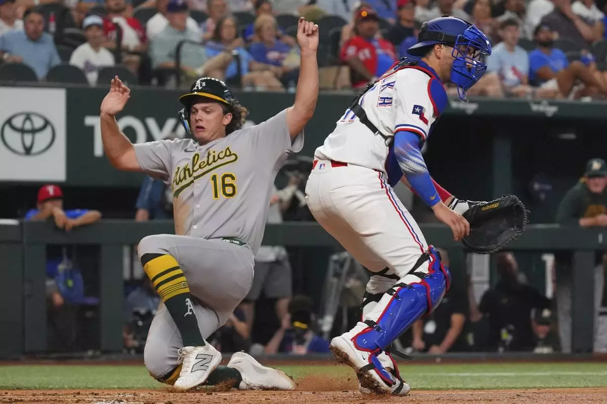 Athletics' Nick Kurtz (16) scores against Texas Rangers catcher Kyle Higashioka, right, on a single by teammate Tyler Soderstrom during the fourth inning of a baseball game, Monday, July 21, 2025, in Arlington, Texas. (AP Photo/LM Otero)
