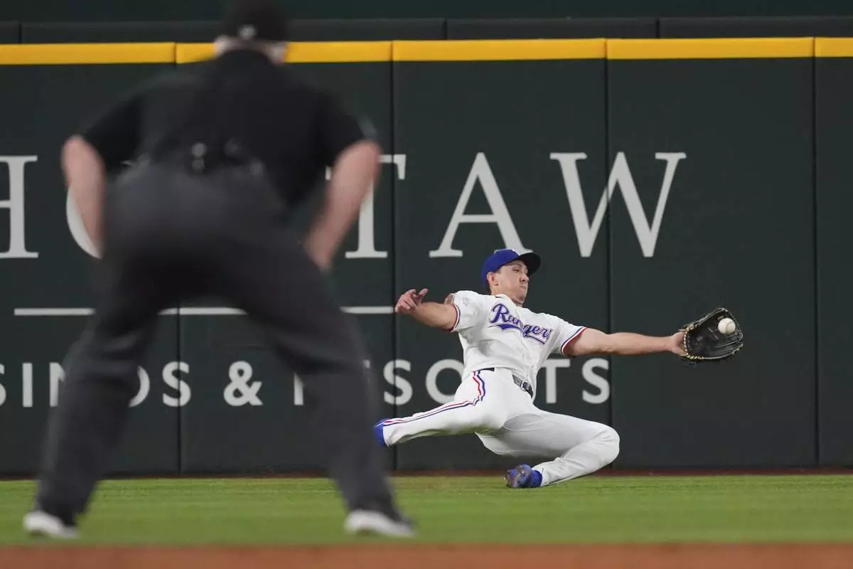 Rangers left fielder Wyatt Langford made a sliding catch on Luis Urias' sinking liner in the left-center gap, then followed with a running grab to take a hit away from Butler to end the A's third.