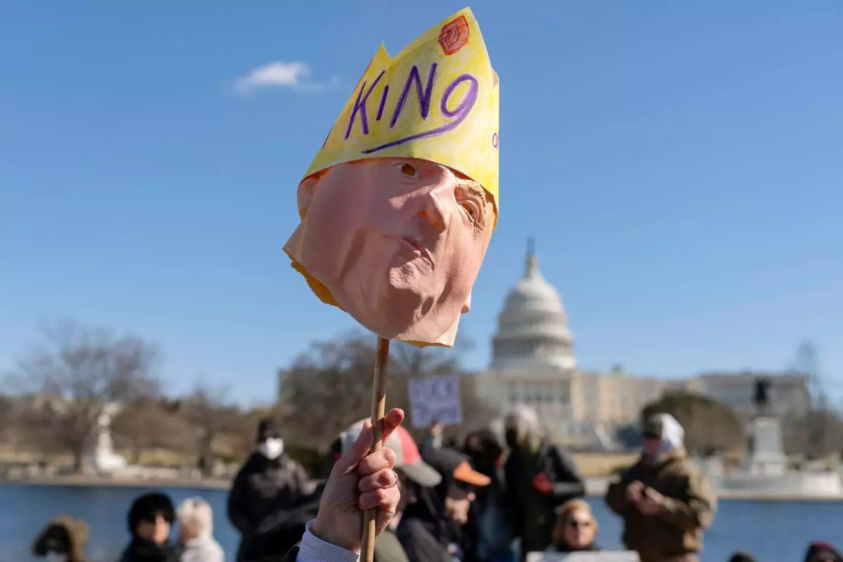 FILE - People protest as part of the "No Kings Day" protest on Presidents Day in Washington, Monday, Feb. 17, 2025, near the Capitol in Washington. (AP Photo/Jacquelyn Martin, File)