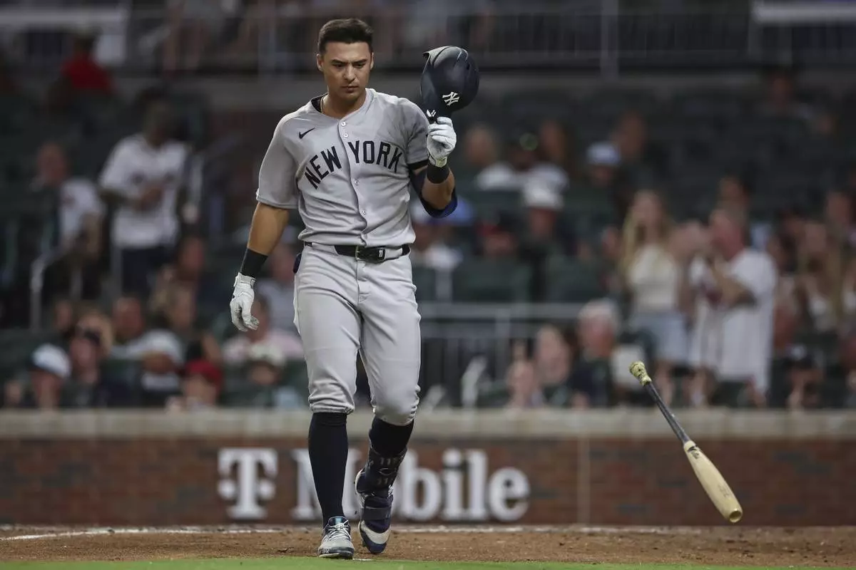 New York Yankees' Anthony Volpe reacts after striking out in the eighth inning of a baseball game against the Atlanta Braves, Friday, July 18, 2025, in Atlanta. (AP Photo/Colin Hubbard)