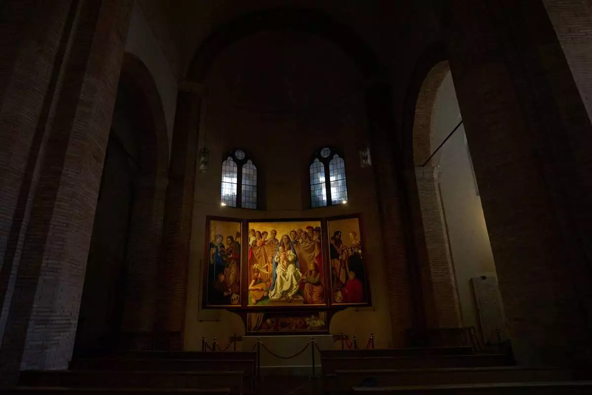 A painting, the central of the triptych, by German artist Michael Triegel who portrayed in 2018 as St. Peter Burkhard Scheffler, a homeless man who died from the cold in 2022, is displayed in the chapel of the Teutonic College at the Vatican, Wednesday, Dec. 10, 2025. (AP Photo/Alessandra Tarantino)