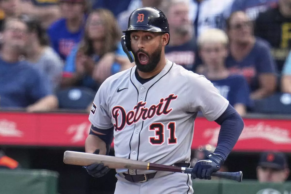 Detroit Tigers' Riley Greene reacts between throws while facing Pittsburgh Pirates pitcher Paul Skenes during the first inning of a baseball game in Pittsburgh, Monday, July 21, 2025. (AP Photo/Gene J. Puskar)