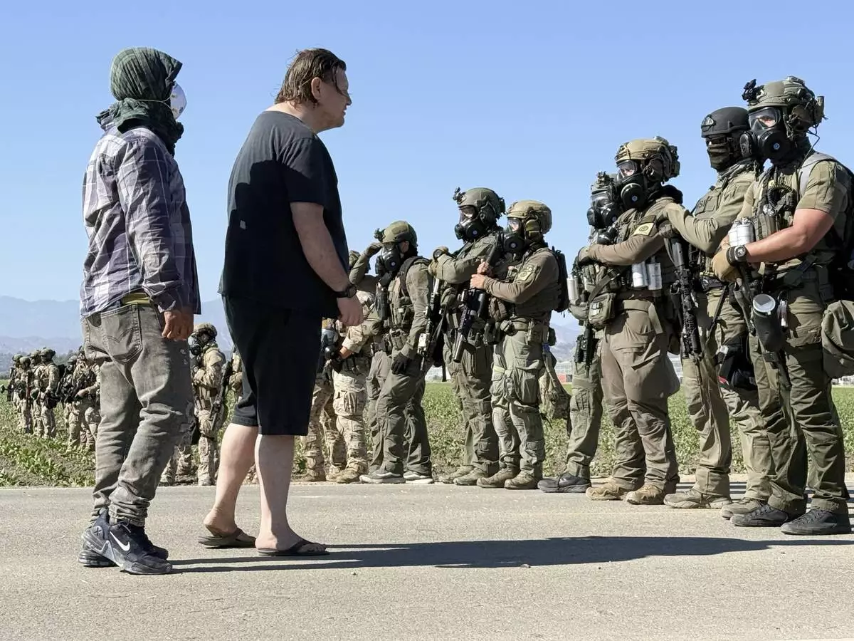 FILE - Demonstrators confront federal agents blocking a road during an immigration raid in Camarillo, Calif. (AP Photo/Michael Owen Baker, File)
