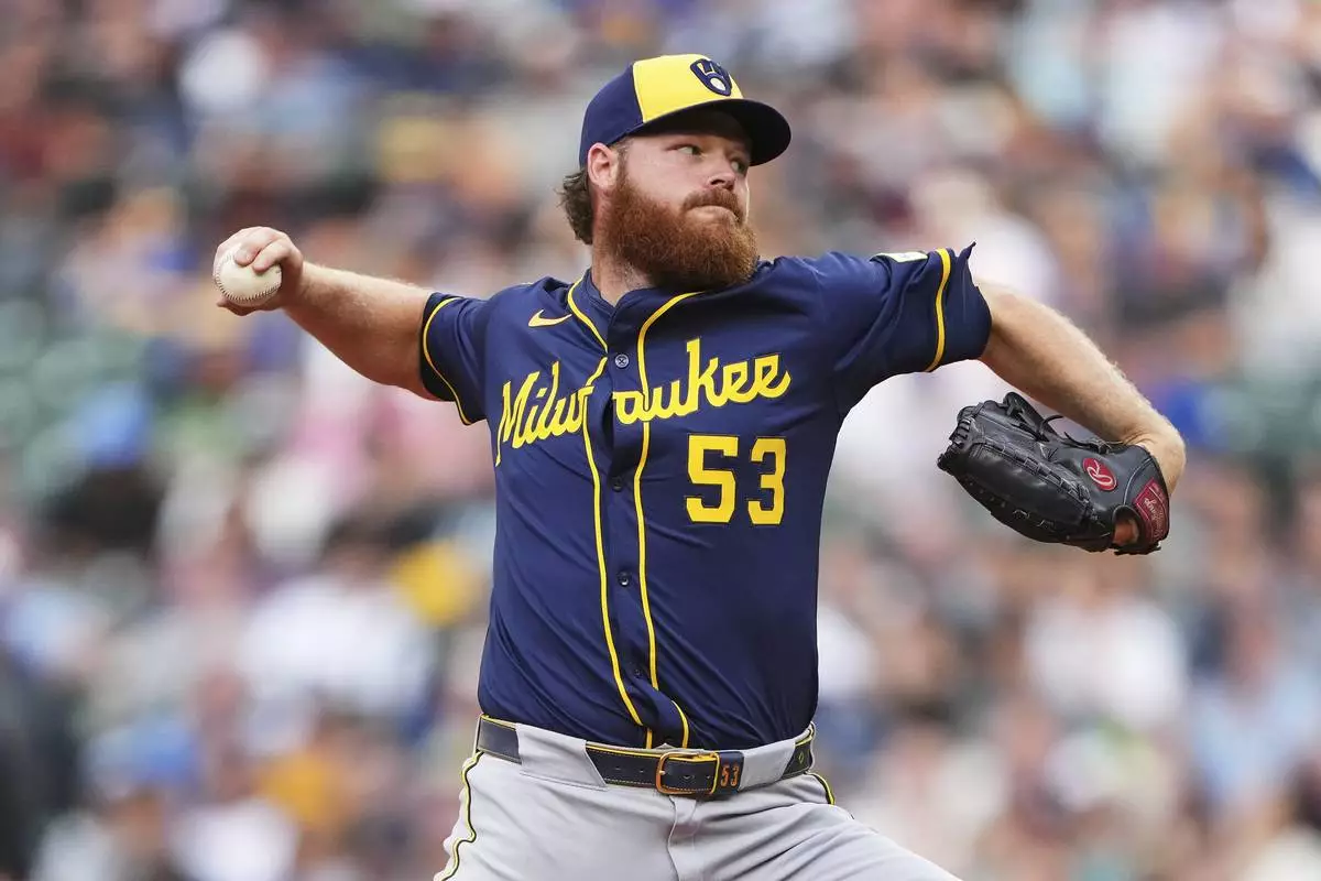 Milwaukee Brewers starting pitcher Brandon Woodruff throws against the Seattle Mariners during the fourth inning of a baseball game Monday, July 21, 2025, in Seattle. (AP Photo/Lindsey Wasson)
