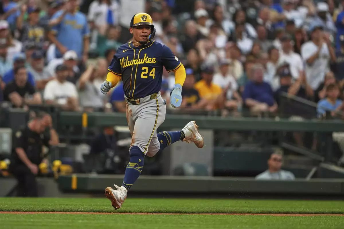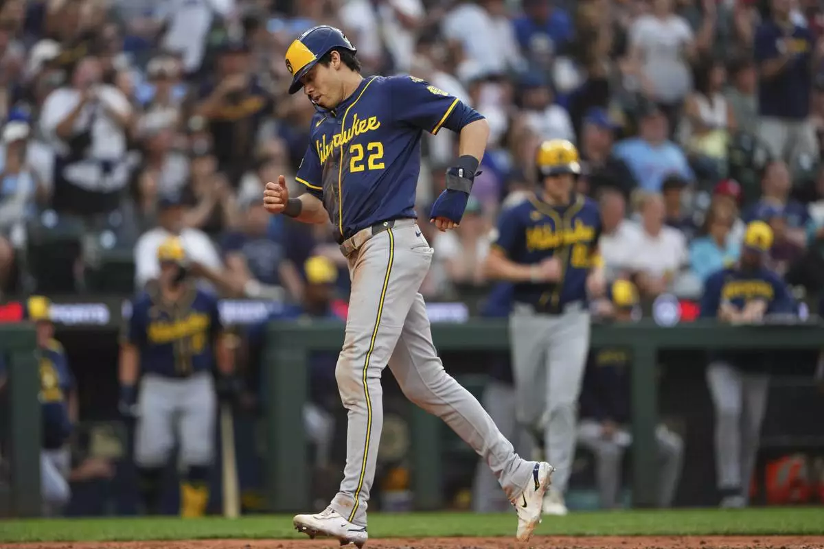 Milwaukee Brewers' Christian Yelich scores on an RBI single from Jackson Chourio against the Seattle Mariners during the eighth inning of a baseball game Monday, July 21, 2025, in Seattle. (AP Photo/Lindsey Wasson)